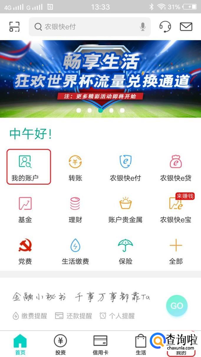 首先,我们打开农行掌上银行,然后如图所示,点击右下角“我的”或者图中标记处“我的账户”登录。
