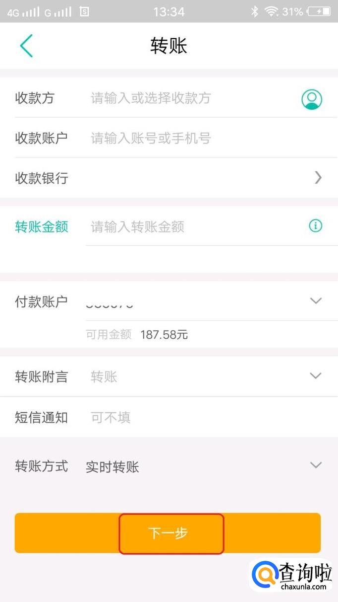 然后我们需要填写转账信息,填完之后点击“下一步”。