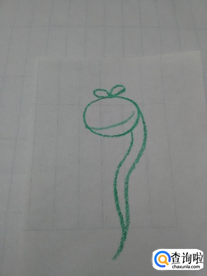在椭圆形的右侧,向下划两条相交的曲线,表示豆子生出的根,豆芽就画完了。