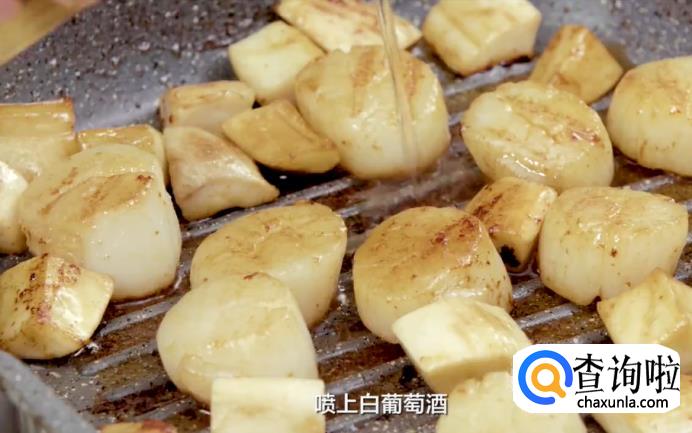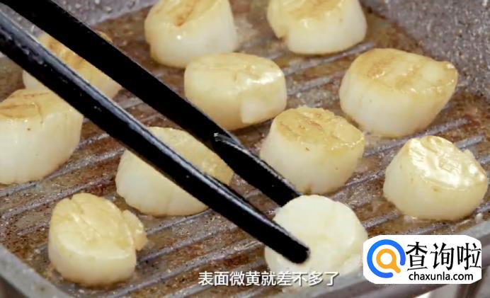 接着,用锅里剩下的油来煎元贝。两面各煎1分钟左右,煎至元贝表面微黄即可。