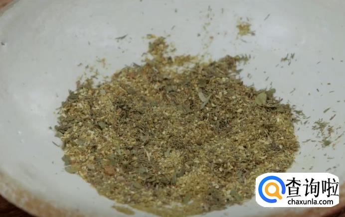腌制的时候,可以做个调料粉来搭配这道菜。将陈皮粉、花椒粉、香芹粉、小茴香粉、莳萝粉倒在盘中,一起混合搅拌均匀即可。