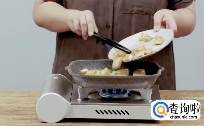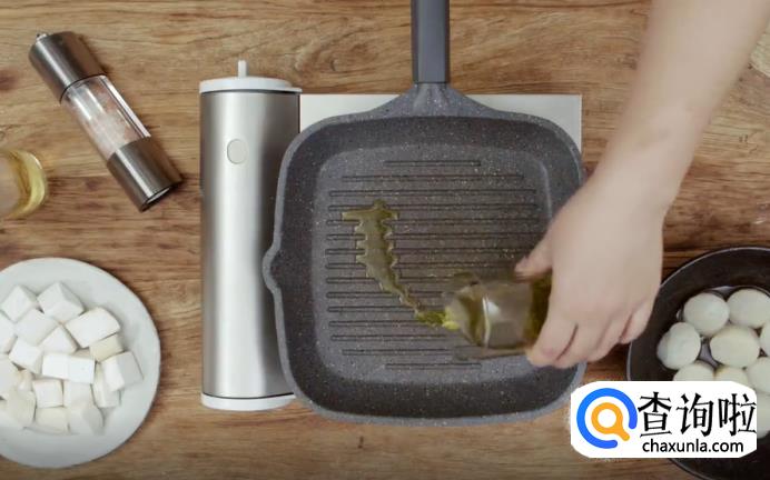 然后,在锅里倒入橄榄油,开大火,待火热之后,放入切好的杏鲍菇,将杏鲍菇的每一个面都煎至金黄色,然后捞出备用。