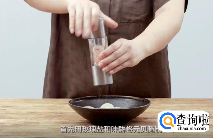 将准备好的元贝装进碗中,加入玫瑰盐和味醂将元贝腌制一下。