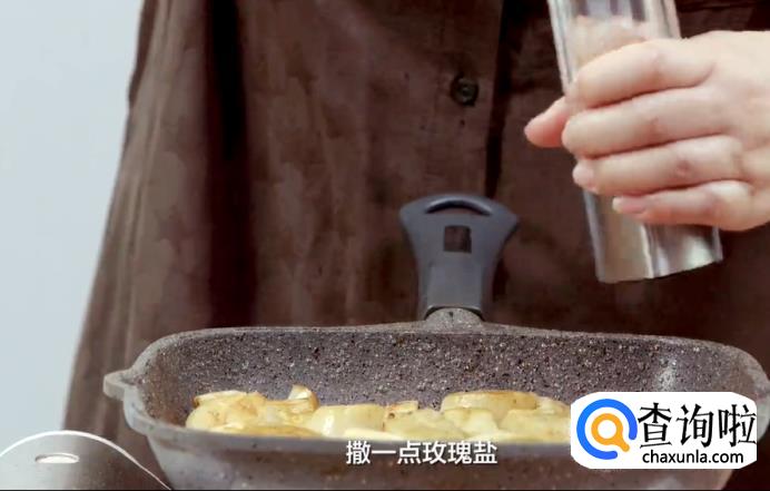 在锅里放入煎好的杏鲍菇,再撒一点玫瑰盐,喷上白葡萄酒,晃动一下锅,让味道更加均匀。