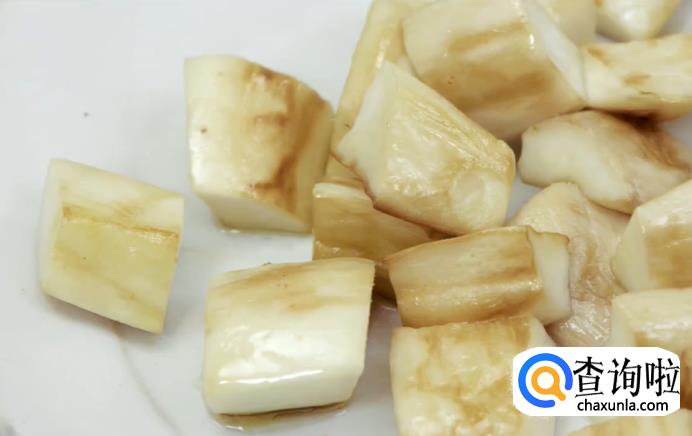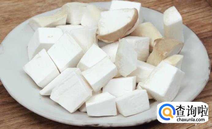 接着,将杏鲍菇切块,大小跟元贝差不多即可,切好后放在盘中备用。