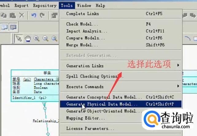接下来我们点击顶部的Tools菜单,选择下拉菜单中的Generate Physical Data Model选项,如下图所示