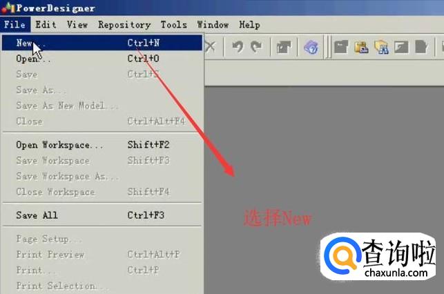 首先打开PowerDesign软件,点击顶部的File菜单,选择下拉菜单的New选项,如下图所示