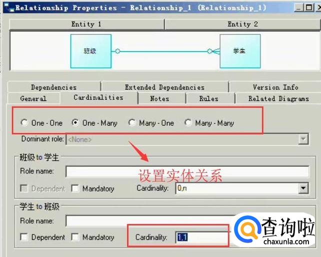然后双击关系线,在关系界面中设置实体之间的关系类型,主要有一对多,一对一,多对多,如下图所示