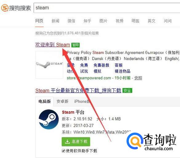 打开电脑,进入搜狗搜索,搜索“steam”,点击并进入官网,如图所示。