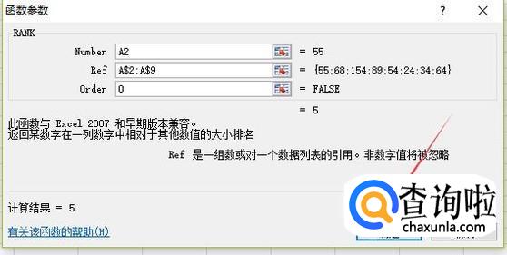 按提示填入相应的数字,在"number"中,填入这列数字中的第一个数字:A2,在Ref中,选中需要排序的所有数字,并加上“”符号,表示绝对引用;在第“prder”中,填入“0”(降序)或“1”(升序),点击确定即可。