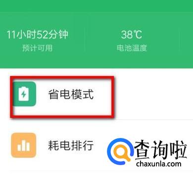 点击:省电模式;进入到设置页面,在这里,看“省电模式”右侧的开关,手指在开关右侧轻点一下,如下图所示的状态即开启成功。