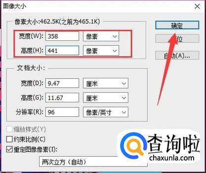 我们把图像宽度改成358 ,长度改成441,如图所示。然后点击界面右上角的"确定",这样图片就修改好了。