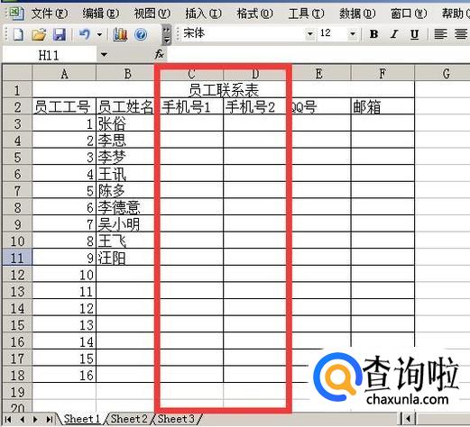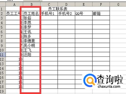然后再把员工姓名对应着员工工号填列进去,然后再把手机号分别对应姓名,填写进表格中(如果有人有多部手机,那么都需要填写进去)。