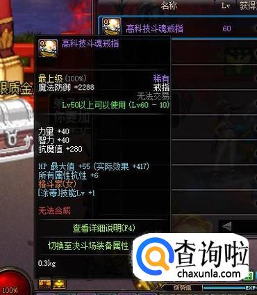 戒指方面,可以在“高科技系列”戒指中,选择“高科技斗魂戒指”,针对毒王可以提升1级的【涂毒】技能等级。