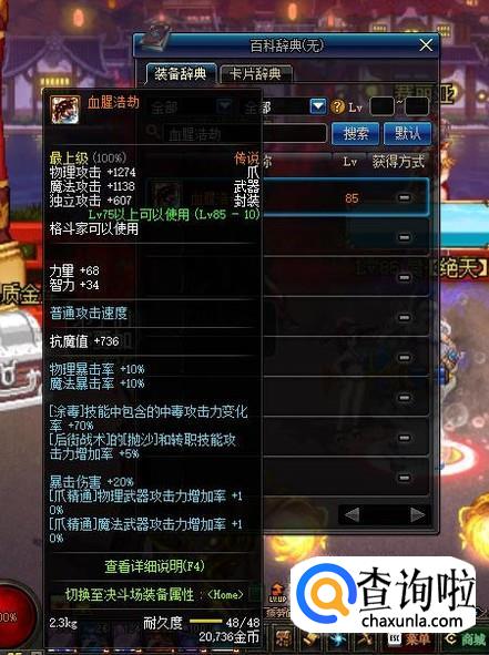 在武器方面,有着两种选择,一种是选择85级传说爪“血腥浩劫”,【涂毒】技能中包含的中毒攻击力变化率+70%;另一种是选择60级神器爪“千足蜈蚣爪”,【涂毒】技能LV+3。