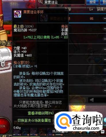 手镯方面,我们可以选择85级传说手镯“黑雾迷云手环”,该装备也可以提供1级的【涂毒】技能等级加成。