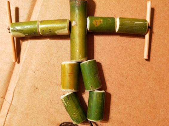 找一节拇指粗细的长竹子。将竹子裁成9小节。第一节做身子,稍长。另外8小节等同长短,作为竹节人的手和脚。将9小节竹子裁好后,在长的那节钻两个孔用来联系手和脚的通道。用小刀,钉子等钻出孔。用两根绳子分别绑住两个小棍子做武器。武器用一根长棍子,两根绳子都绑在一根棍子上。穿两节竹子做手臂。