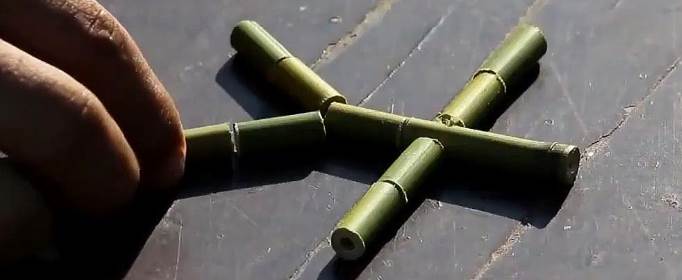 2、将9小节竹子裁好后,需要在长的那节钻两个孔,这是联系手和脚的通道。用小刀,钉子等等钻出孔。用两根绳子分别绑住两个小棍子做武器。武器用一根长棍子,两根绳子都绑在一根棍子上。