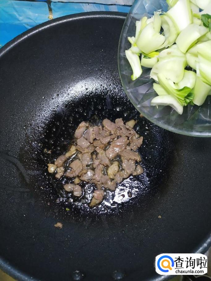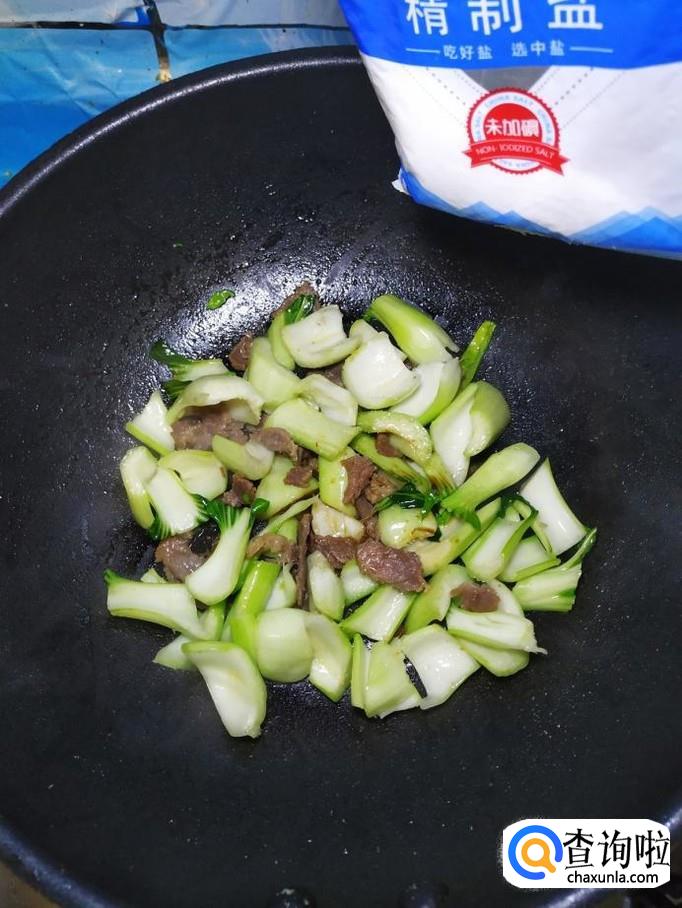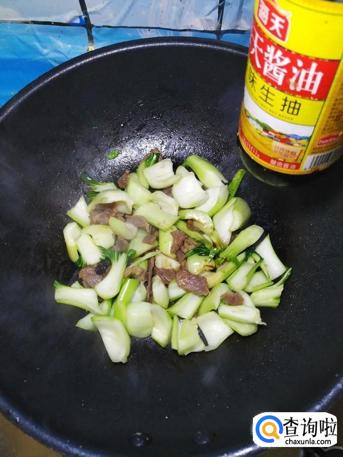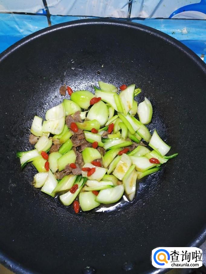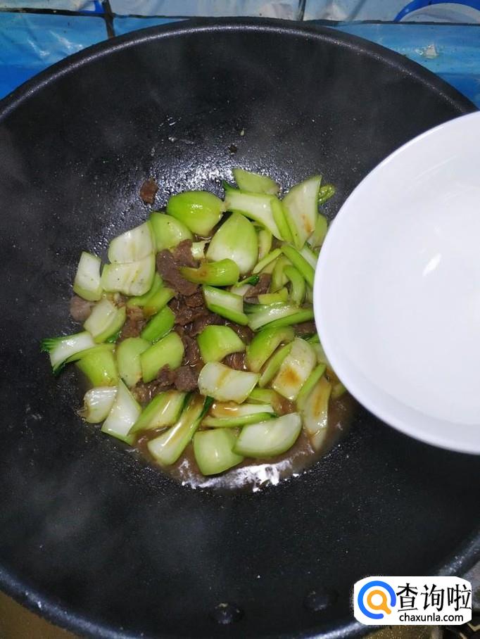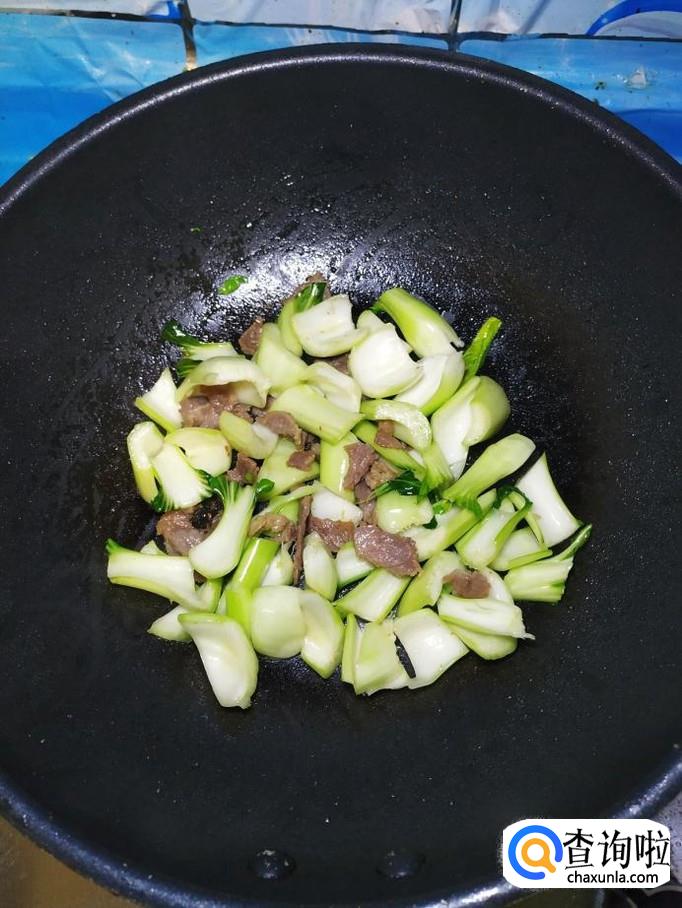 将准备好的青菜根茎块,倒入锅中,和牛肉一起翻炒均匀。