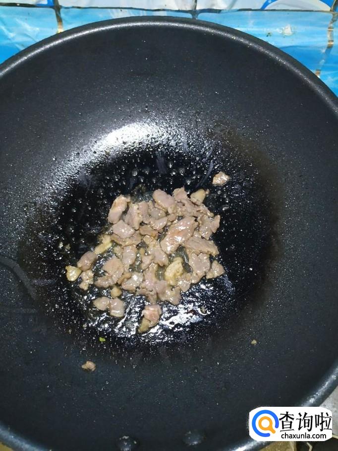 炒锅中放入适量油,油热后将腌好的牛肉倒入锅中炒香,牛肉片切得比较薄,所以很容易炒熟。