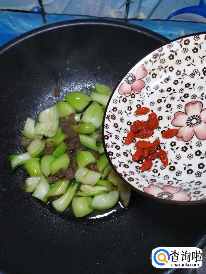 准备适量枸杞子,将枸杞子用清水泡开,将泡好的枸杞子,倒入锅中,翻炒均匀。