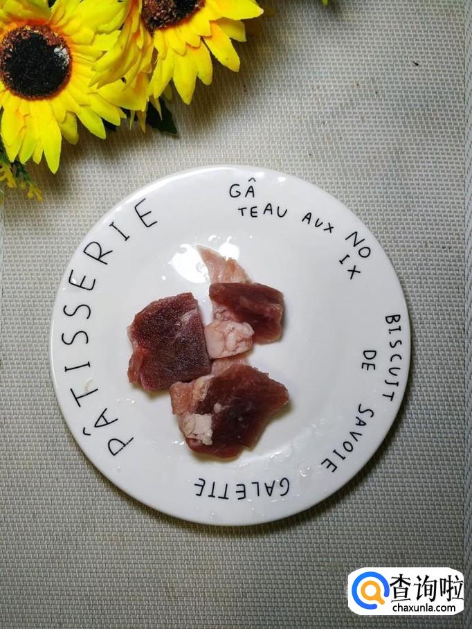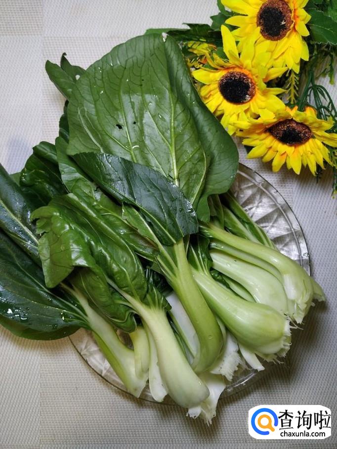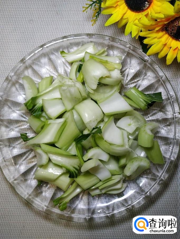 准备适量新鲜的青菜,用清水洗净,特别是将根部的泥沙,全部洗干净,然后将叶子去除,只留根茎部,小编这次买的青菜,根茎长的很好,将根茎部切成块,放入盘中备用。