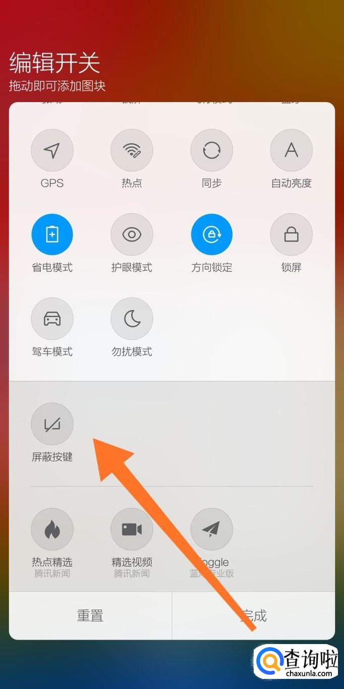 最后就可以自定义通知栏显示的功能图块,拖到功能图块至白色区域就可以打开该功能图块在通知栏的显示。拖到功能图块至灰色区域,就可以关闭该功能图块在通知栏的显示。