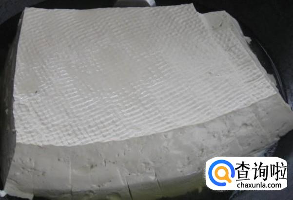 豆花形成后盖上盖子3--10分钟,接着将成型豆花舀出来,放入铺有纱布的竹筐内,滤水,然后将纱布翻上来,重物压住直至成型,这样豆腐就做好啦。