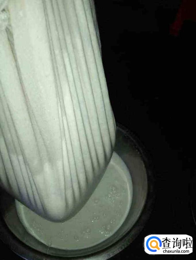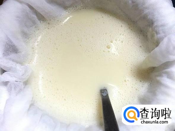 接着将打好的豆浆用纱布滤出,挤出豆渣中的水分,将过滤出的豆浆上的泡沫除去