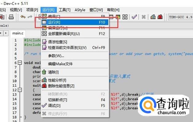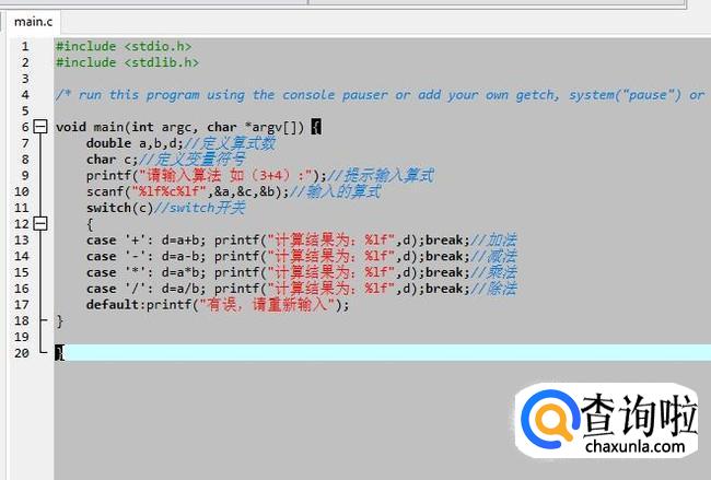 然后我们在C文件中写入计算器逻辑代码,主要是让用户输入计算方式,然后程序自动计算,如下图所示