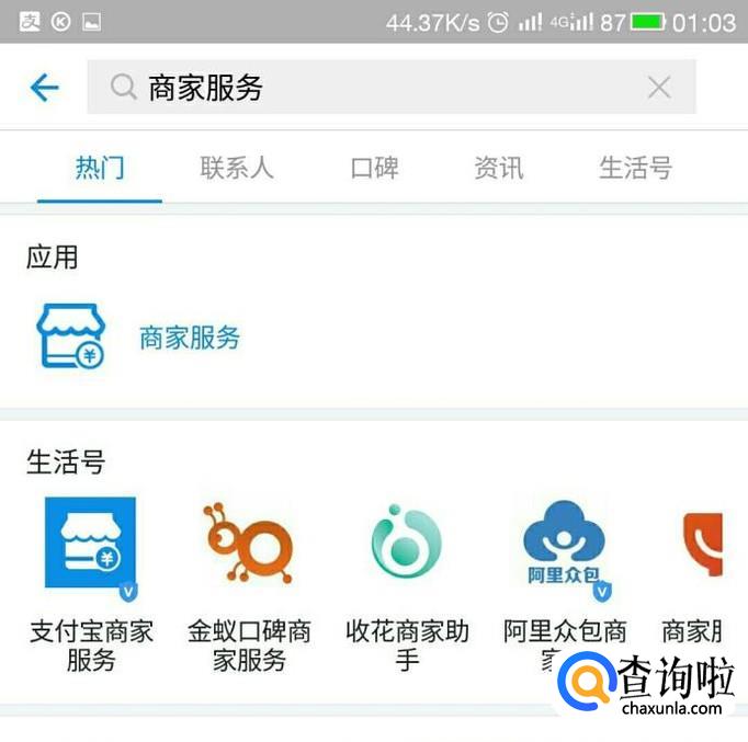 打开支付宝,找到最前面的搜索栏,输入“商家服务”,搜索,