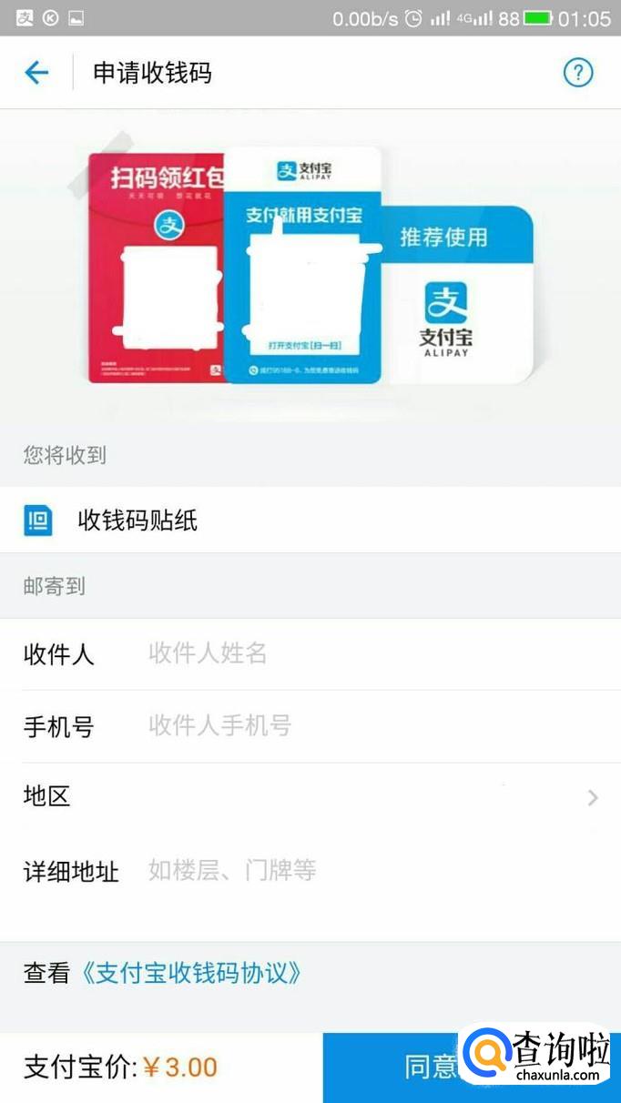 我们选择点击“申请收钱码”,然后在接下来的界面里填写邮寄人信息和地址。点击同意并申请。