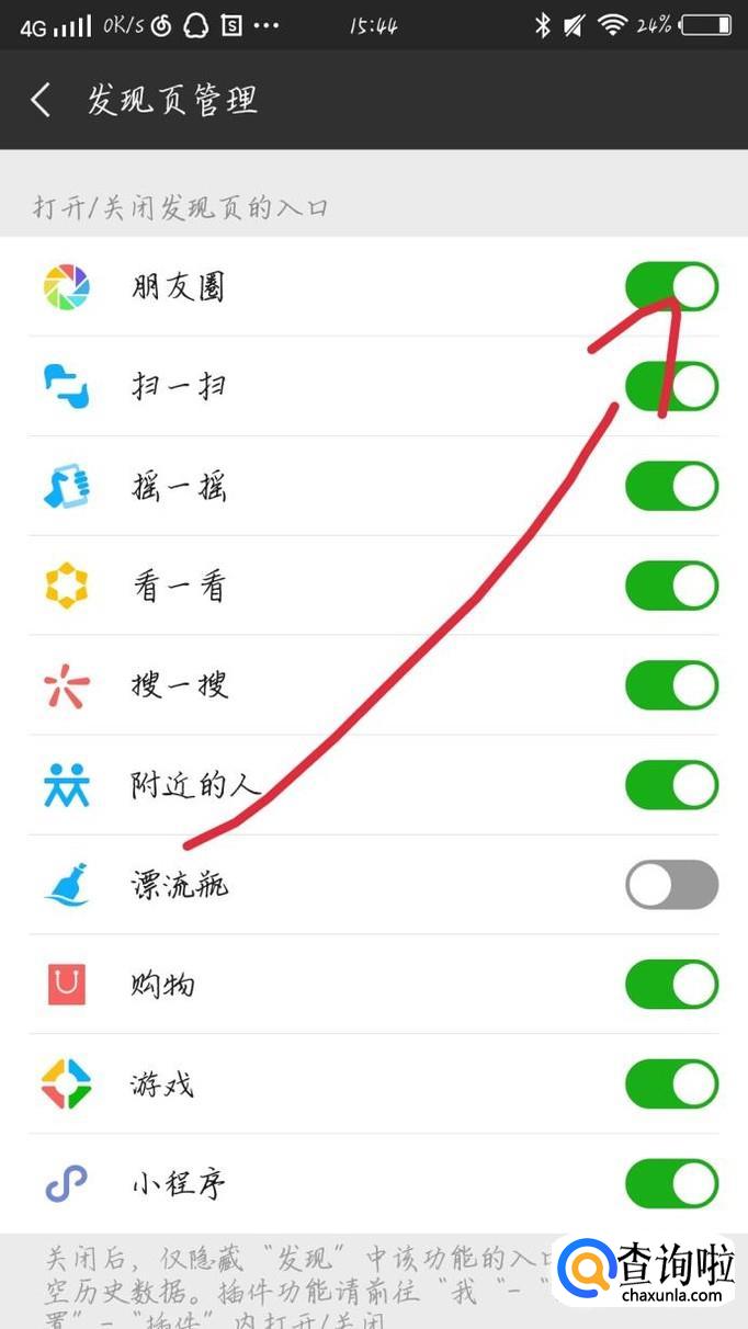 点击“发现页管理”选项,如图1箭头所示。你会看到出现一个新的界面,如图2所示。把朋友圈关掉就可以了。