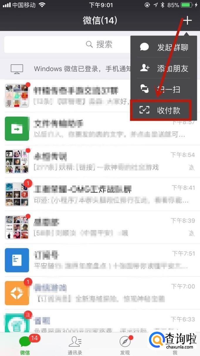 然后点击屏幕上方的“+”并点击收付款,如下图所示。