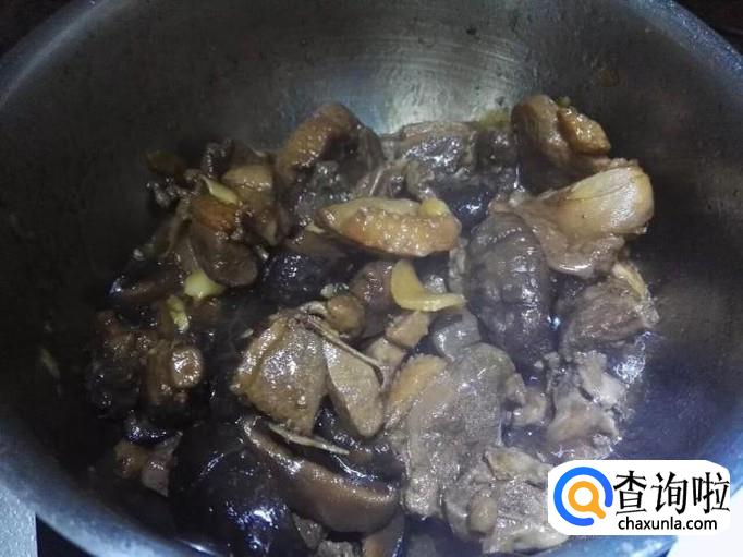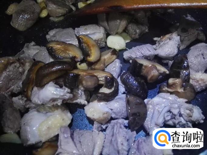 将姜蒜片,鸭肉一起倒入锅中翻炒至鸭肉的肉缩紧