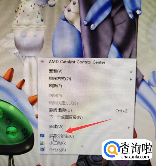 在电脑桌面空白处右击,选择“屏幕分辩率”。