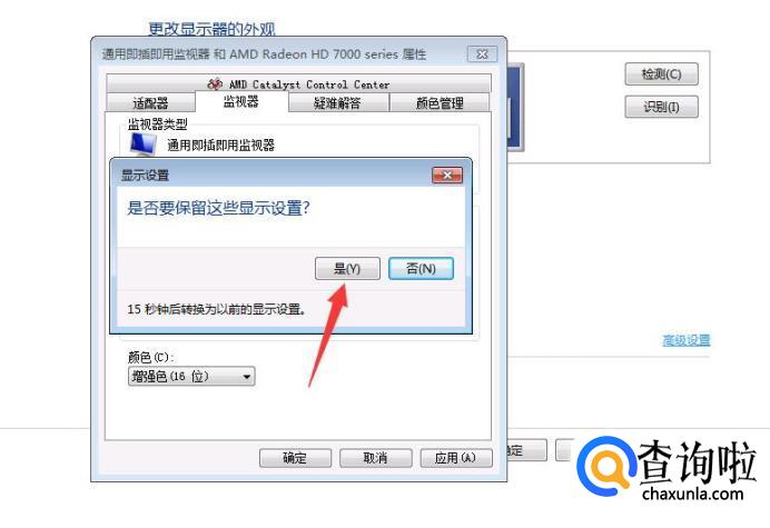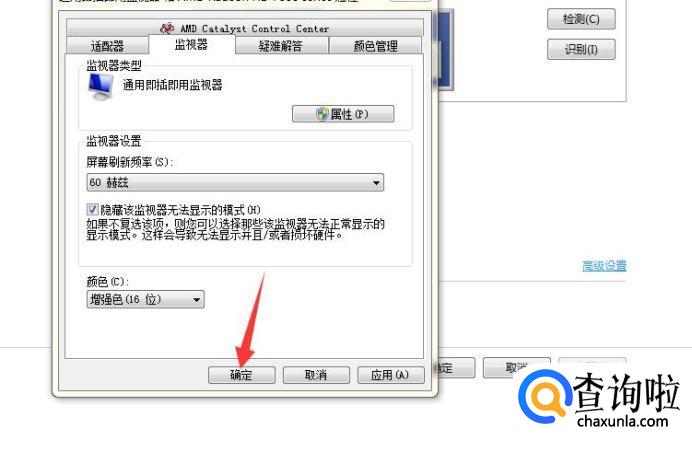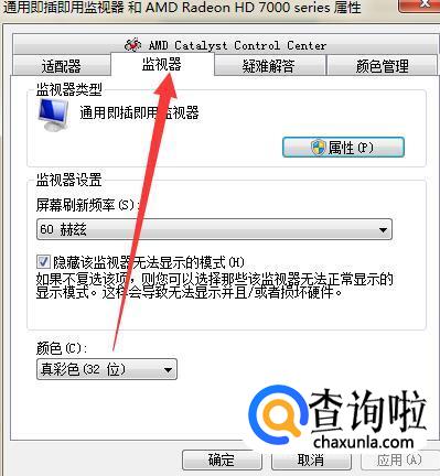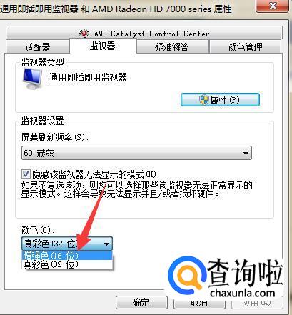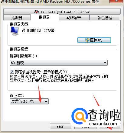 然后如图,把颜色选项中的“真彩色32位”改为“增强色16位”,并点击应用。