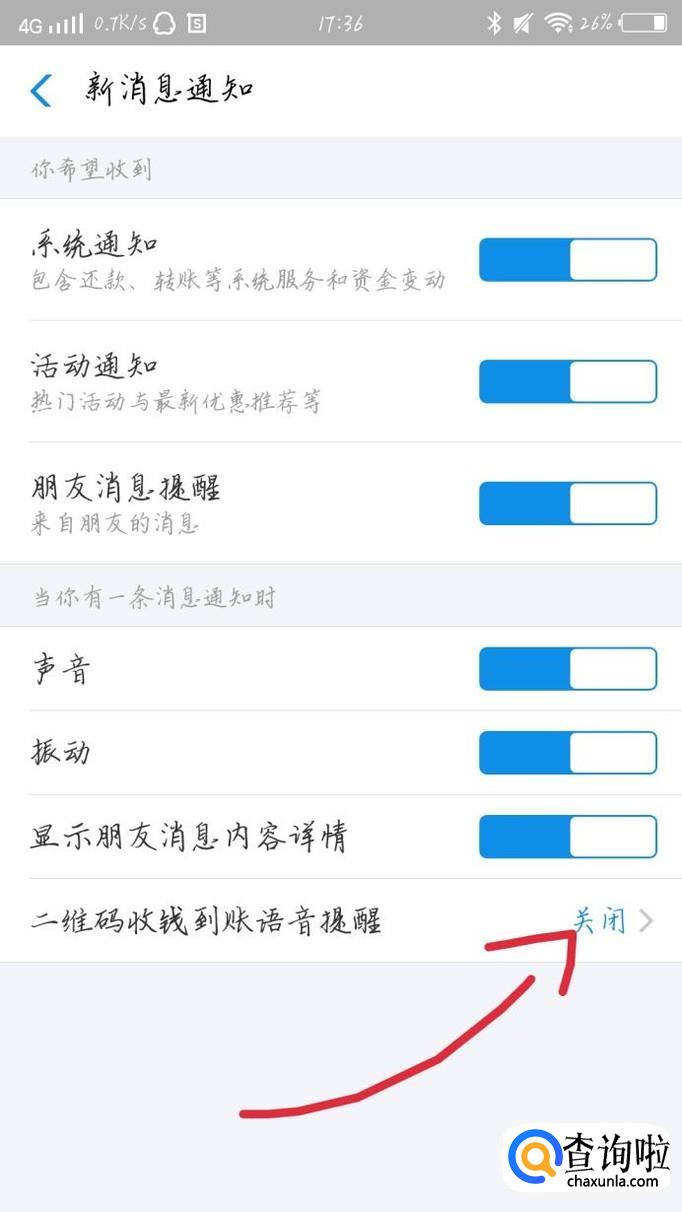 会出现一个新的界面,将“支付宝收钱到账语音提醒”打开就可以了,如图1箭头所示。