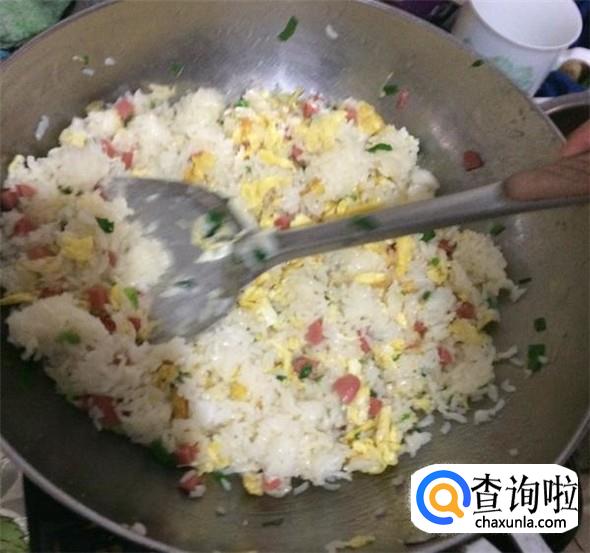 等到大米与材料充分混合后,关火,将炒饭盛出即可。