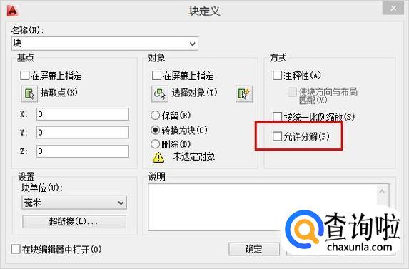 块无法分解有两种情况。第一种情况是,创建块的时候“允许分解”前的对勾没有打。