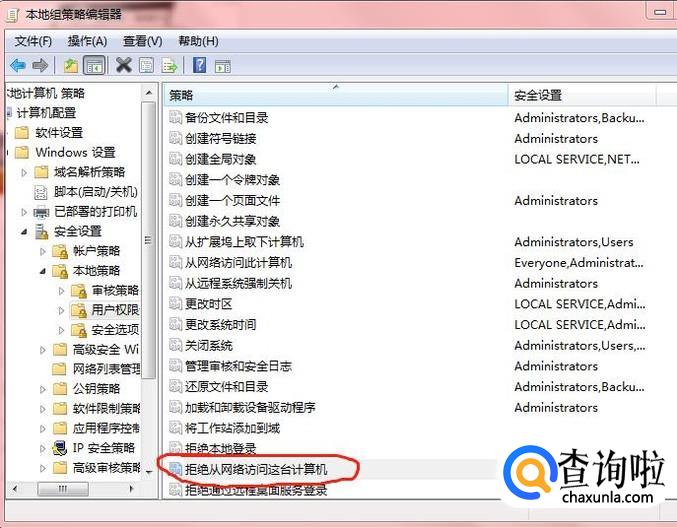 在打开的界面里面点击计算机配置—windows设置—安全设置—本地策略—用户权限分配