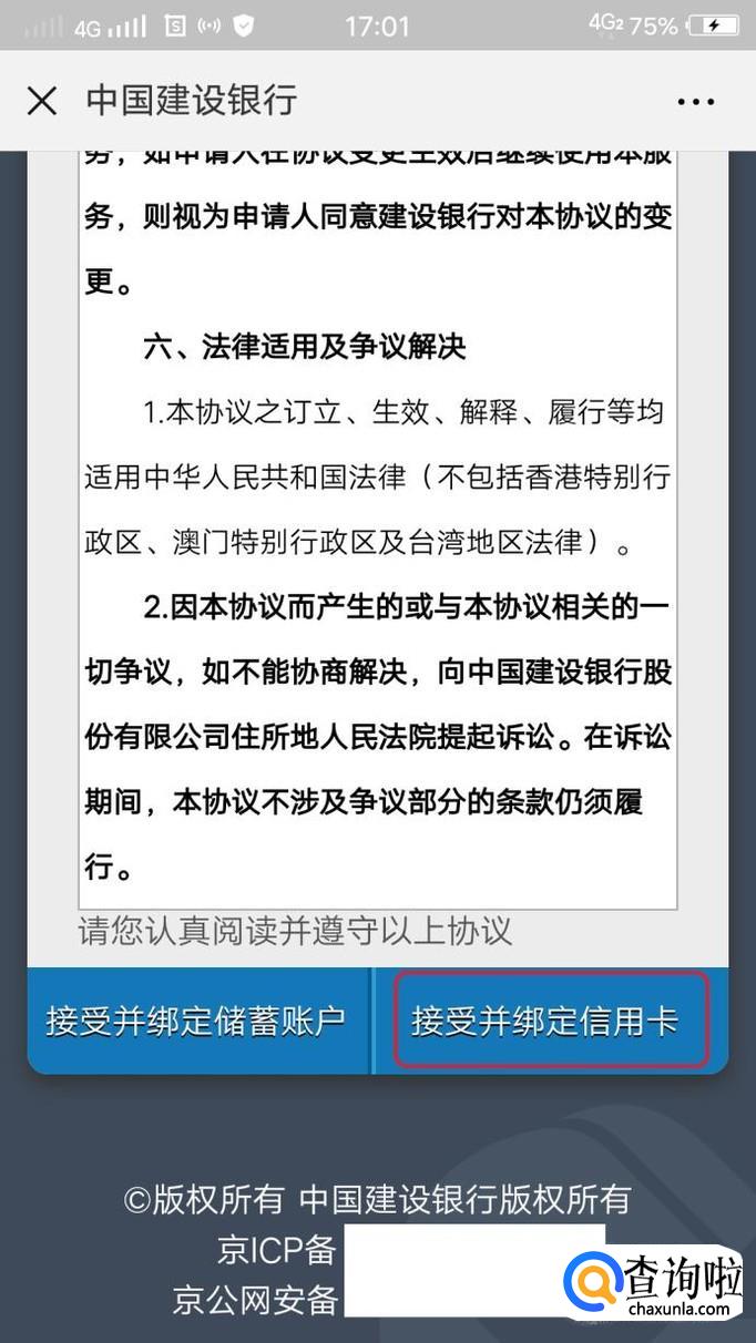 验证通过后,系统会自动匹配与您身份信息绑定的建设银行的信用卡账号,我们点击“提交”就可以绑定微信了,绑定成功,关闭页面即可,下次就可以直接在微信上查询信用卡账单和消费记录了。