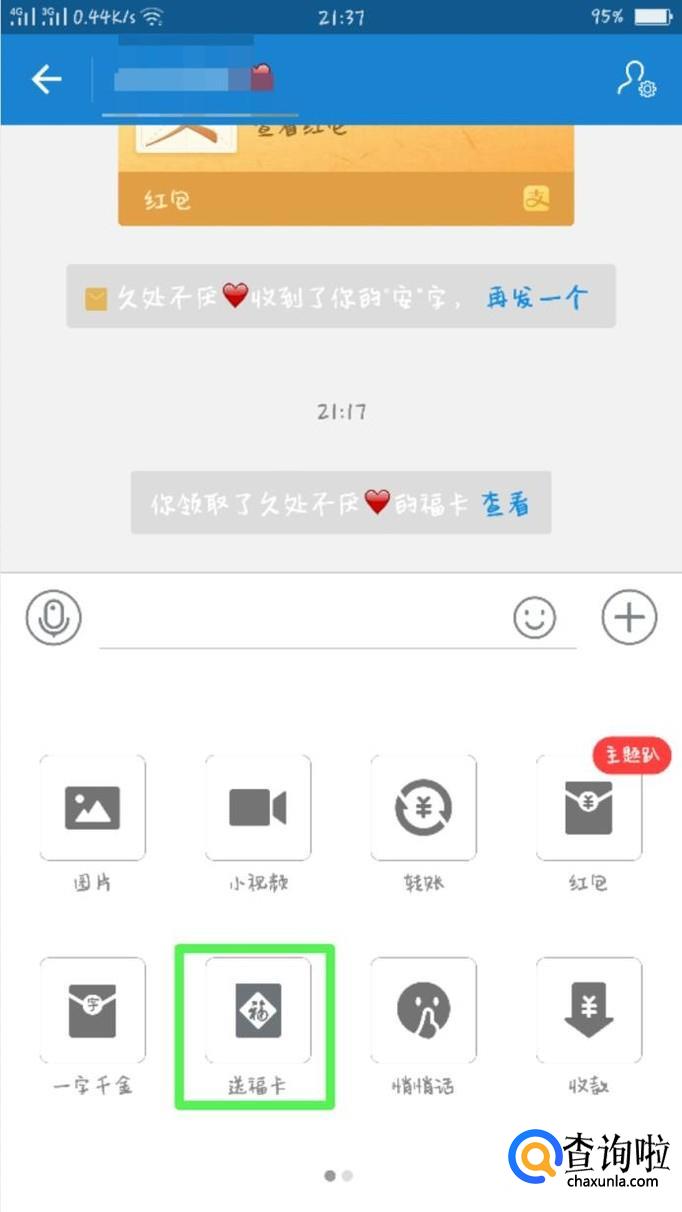 点击发送信息的旁边的“+”符号,就能出现发福卡的选项啦。