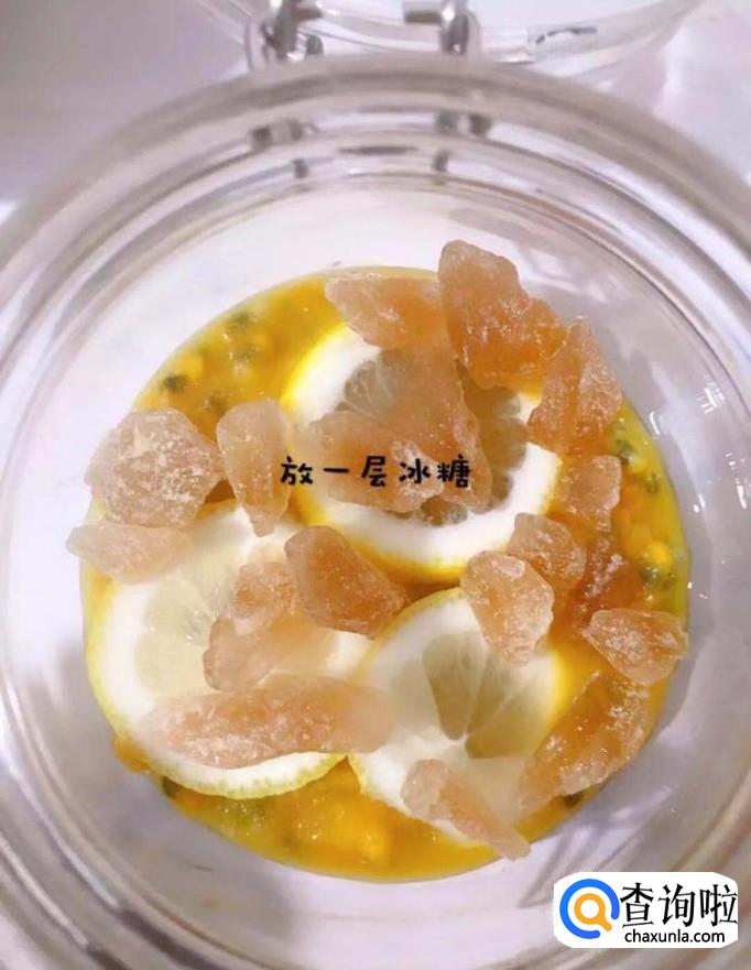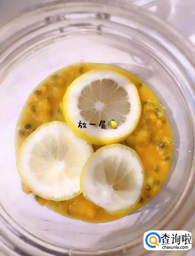 然后将柠檬和百香果用一层柠檬一层百香果的方式放进密封罐,如下图所示。