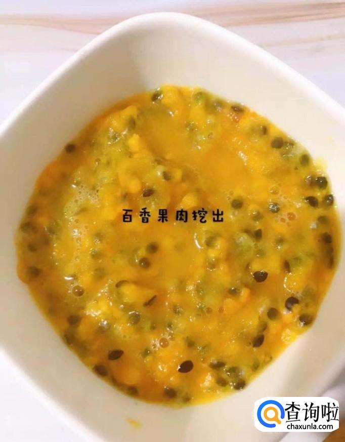 然后用勺子把百香果肉挖出,放进碗中,如下图所示。