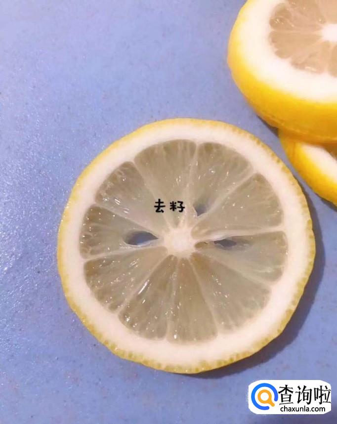接着用盐把柠檬的外皮搓洗干净,切成薄片,去掉柠檬籽,如下图所示。