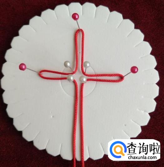 取一根线绳,对折,左右两条线再对折,成十字形,将绳子用珠针固定在插垫上。