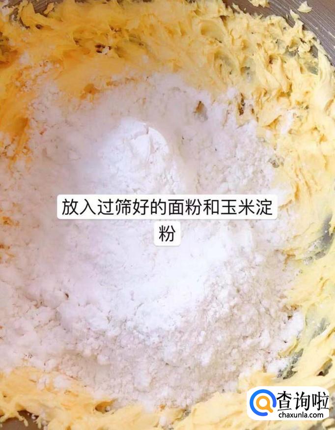 接着把面粉和玉米淀粉过筛加入碗中,如下图所示。