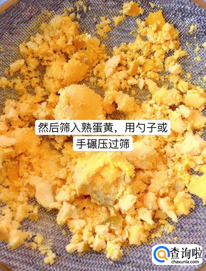 然后在一个碗中放入两个熟蛋黄用勺子或者手碾压过筛放到装着黄油的碗中,如下图所示。
