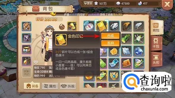 除了魂卡秘境获得之外,如果你的背包中还有“金色印记”的话,可以直接使用金色印记来进行合成,25个就能够合成一个金色品质的魂卡。